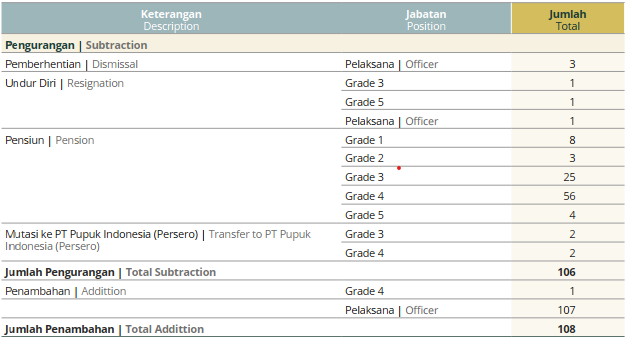 - Bertambahnya 107 karyawan Grade Pelaksana bisa berasal dari berbagai jalur, termasuk program magang BUMN (MAGENTA), tenaga kontrak yang diangkat menjadi karyawan tetap, atau rekrutmen internal dalam ekosistem Pupuk Indonesia Holding Company (PIHC).